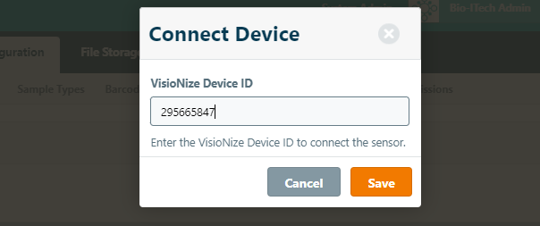 To connect the sensor enter the VisioNze DeviceID (note that currently you can only retrieve the Device ID from the URL in VisioNize when the device sensor data is displayed) and click Save.