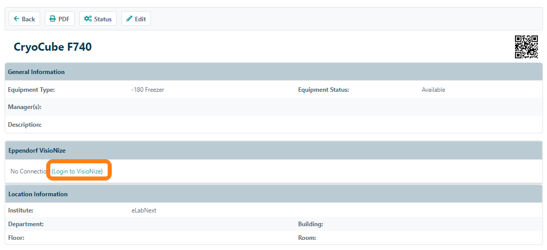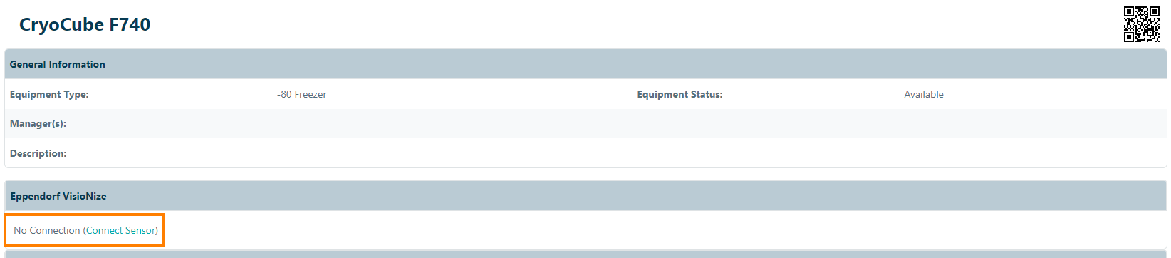 To connect a sensor to your device in eLabInventory, navigate to the storage unit of equipment to view the device. On the device the Eppendorf VisioNize section is listed.