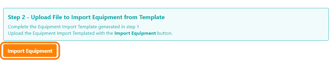 Once the equipment import template has been completed, proceed to step 2 and upload the completed Import Equipment template. We recommend to upload a first import template with a limited to number of equipment to validate equipment is imported as expected.