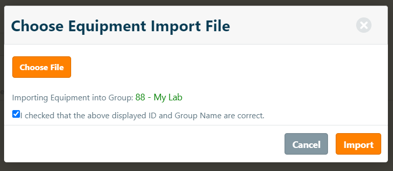 Confirm that the uploaded equipment import template will import equipment by checking the corresponding checkbox and click Import to execute the equipment import.