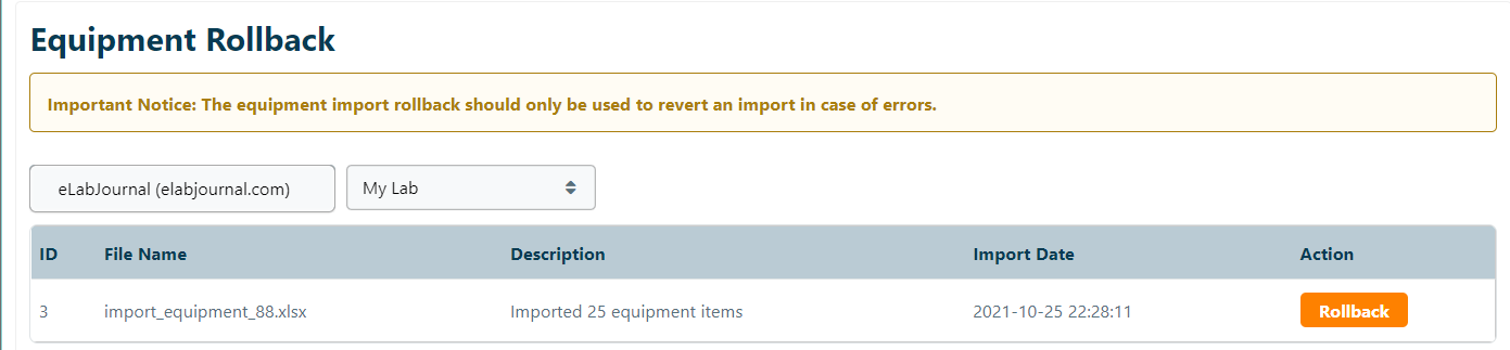 Once equipment has been imported, confirm that all equipment has been migrated correctly. In case of a unexpected import result, there is a equipment import rollback function available to rollback any imports. Navigate to Rollback Equipment Import under Imports in the System Admin Panel. Select the equipment import that should be undone and click Rollback. Please note that the option to rollback equipment imports is only available for 7 days after execution of the import.