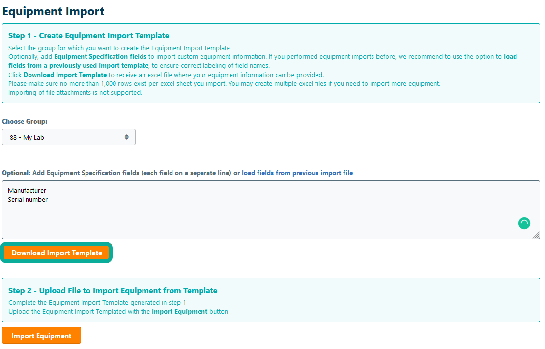 Select the group for which you equipment should be imported. Optionally, can add any custom equipment specification fields, by entering the field names in separate lines in the corresponding field. In case you imported equipment before, we recommend to load the equipment specification fields by uploading this template.