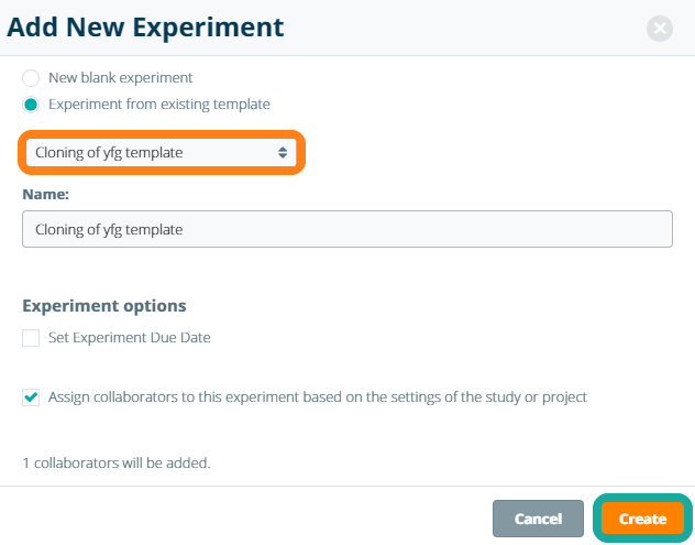 Once the experiment template has been shared, it can be selected from the list when creating an experiment from a template. Click Create to create a new experiment from this template.