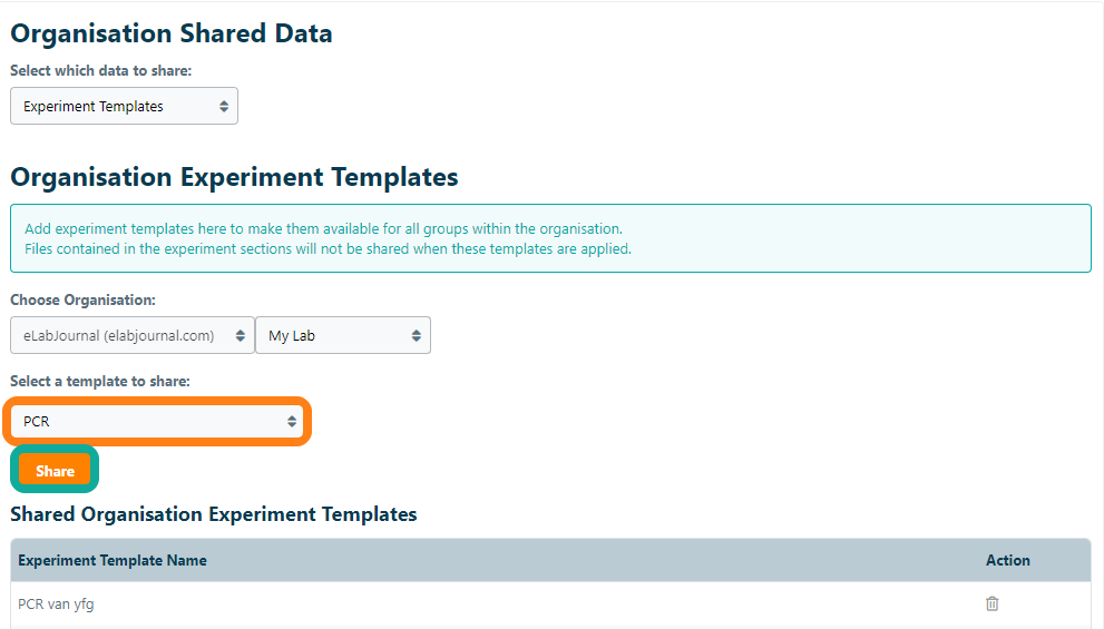To make experiment templates centrally available within your organisation, navigate to Organisation Sharing in the Organisation Admin panel and select Experiment Templates in the dropdown menu. Then select the group the experiment template is in and select the template. Then click Share. Now this template will be available for all the groups in your organisation.