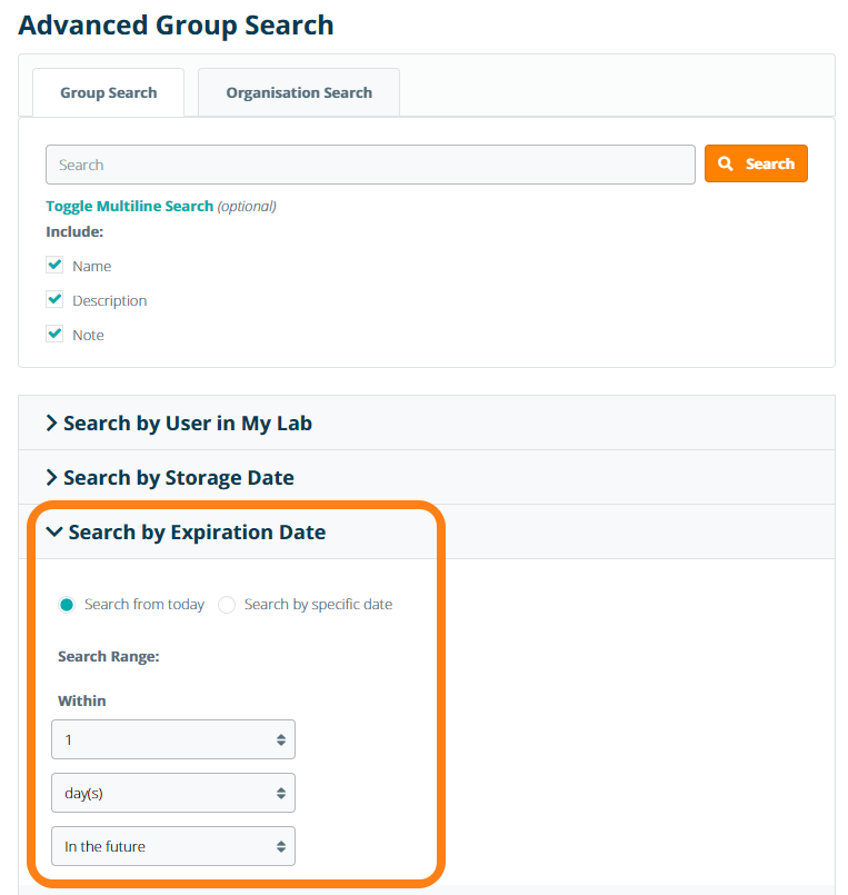 In the Advanced Search you can find samples by expiration date. In the Expiration Date tab, you can set the conditions find items in the inventory that will expire or already have been expired.
