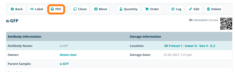 Sample information can be exported from eLabInventory in PDF format. Open the sample information sheet of the sample you want to export and click PDF.