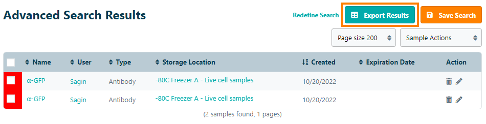 The returned samples are displayed in the search results list. Click Export Results to create a tab-delimited CSV file that can be opened with or imported into Excel.