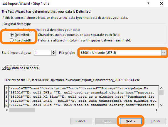 Browse to the saved sample export file and select it. A 3-step wizard in Excel will help you to import the samples in Excel. Choose in the first step the following settings: