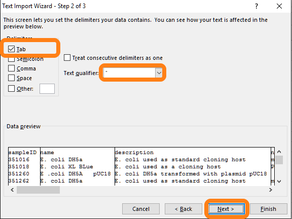 In the next step, you can define how to separate the data and which text indicator to choose. Choose the option Tab and ” (double quote). In the preview window, the data should be separated correctly in different columns.