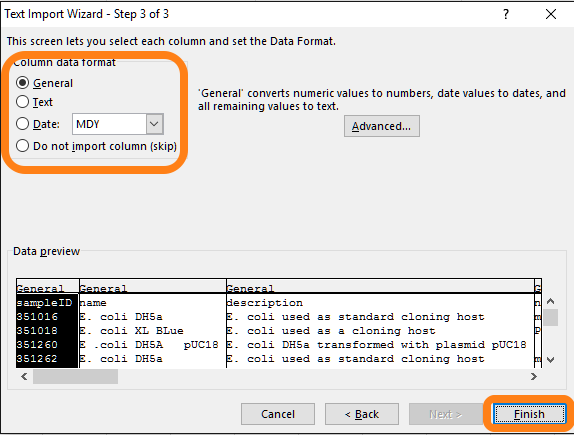 In the last step, you can define the data type should for each column. The default setting is standard. You can scroll through all columns to see if the preview of the data is accordingly. For most columns, the standard-setting is works alright. Only when there are punctuations (such as: ' or, or ") used that could be interpreted by a spreadsheet program as a separator these columns should be changed from General to Text. For columns that contain a date or date and time, make sure to change these columns to a date and select the date desired formatting.