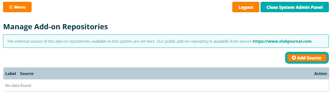 All public add-ons can be retrieved from the eLabInventory public repository which is available on https//www.elabjournal.com. For customers with a Private Cloud or On-Premises installation, the Public repository can be added as default setting in your system installation.