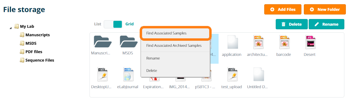 To find samples that are linked to a specific file, you can open the file storage and use the right-mouse click action on a file and choose the action Find Associated Samples in the context menu.
