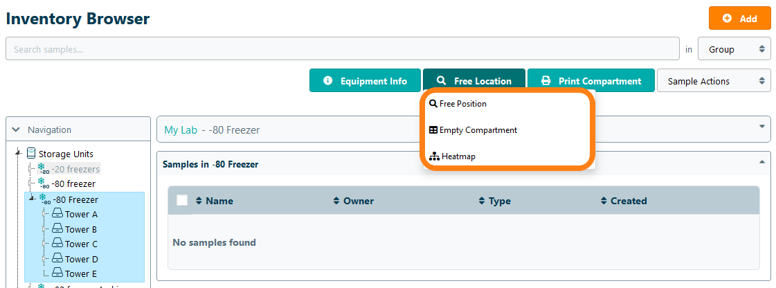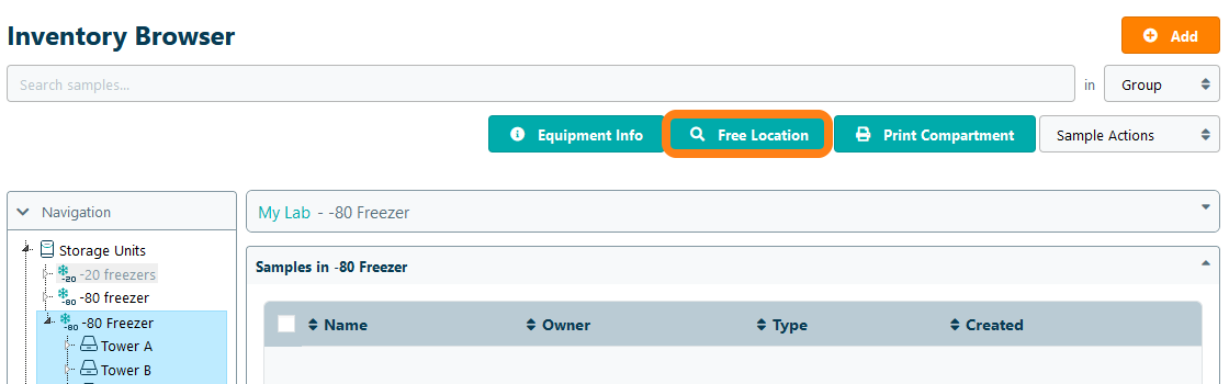 To find an open location for storing samples in the lab inventory, navigate to the Inventory Browser under the Inventory tab. Select the storage unit or compartment in the navigation tree and click Free Location.