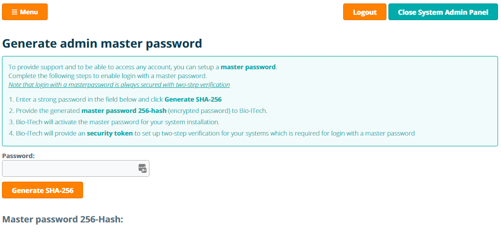 The generated SHA-256 key should be provided to Bio-ITech to be installed on the eLabInventory Private Cloud or On-Premise system installation. For security reasons, the master key login is protected with a mandatory 2-step verification. After providing the Bio-ITech with the generated SHA-256 hash of the chosen master key, Bio-ITech will provide the System Administrator with a security token to set-up 2-factor authentication (compatible with Google Authenticator, WithAuth or Protectimus Slim mini). The master key login for every account requires in addition to the entry of the master key, the additional entry of the 2-factor code.