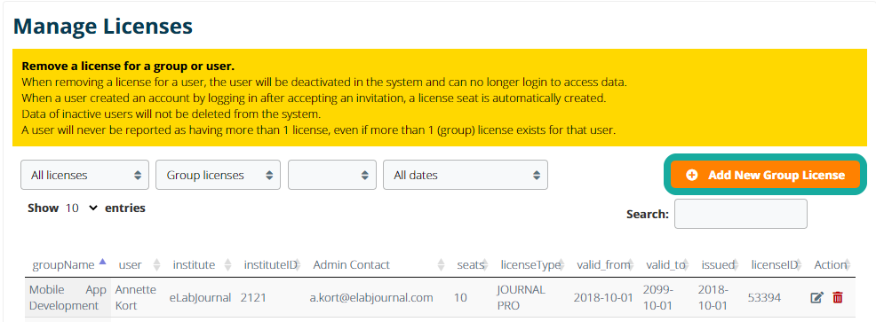 Important: when you want to issue a license for eLABJournal, the group should get the following licenses: