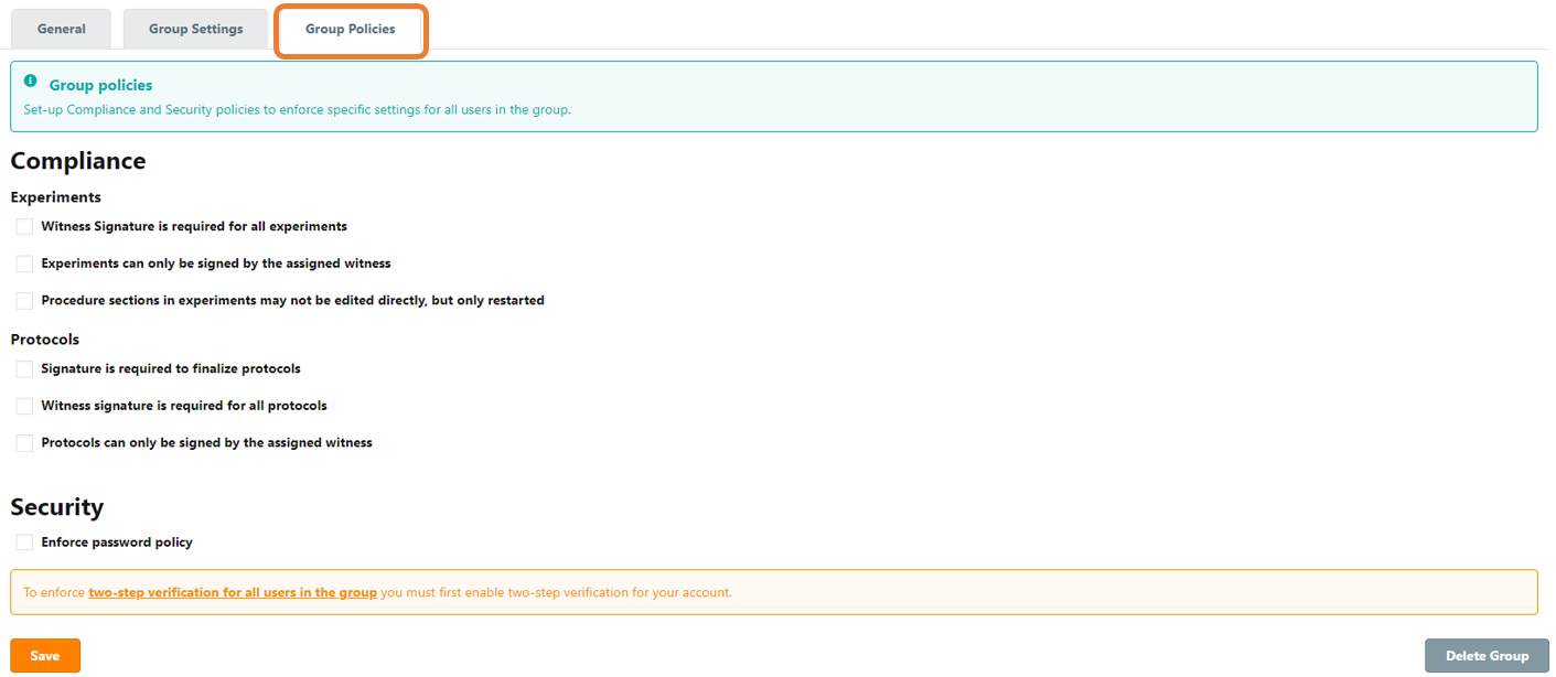 - Enforce Two-Step Verification – enforce two-step verification for all lab members when logging into the application
