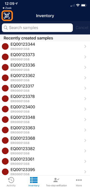 The Inventory tab displays a of the recently added samples. In the Inventory you can search samples or you can use the camera of your mobile device to scan a barcode of a sample to view the relevant sample information. You can also scan barcodes to view information sample series, storage units, compartment or equipment. Scanning samples can also be done with a 2D barcode scanner.