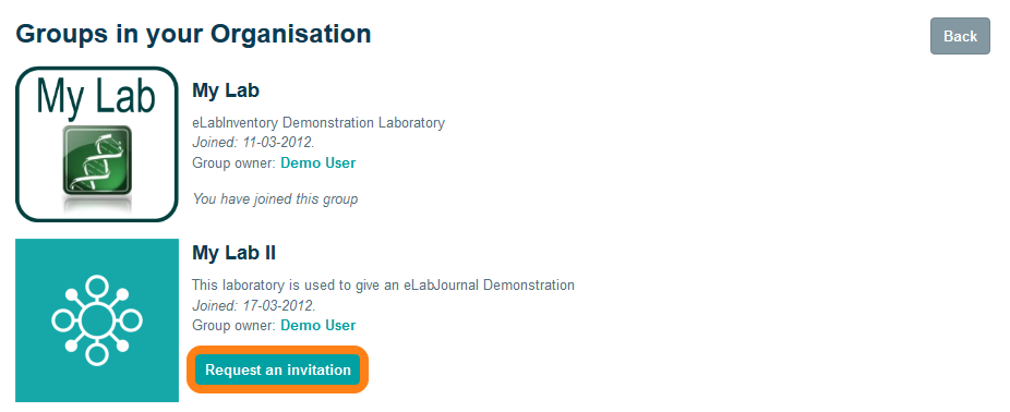 Click Join Group to view a list of all labs in your company or institute. Choose the lab you would like to join in your organization and click Request an invitation. Note that groups in the system are automatically linked to an organization when the group is created by a user. Users are linked to an organization in a system based on their email domain. In the event that your lab moves to another organization, please contact us to migrate your group.