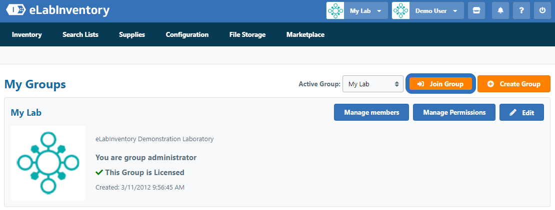 After setting up your account, you have the option to Create a Group or Join a Group. If your lab is new to any of our applications, you should create a group. If your lab is already using eLabInventory and you want to gain access to their workspace, you should send a request to the group administrator to join the group.