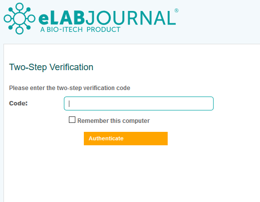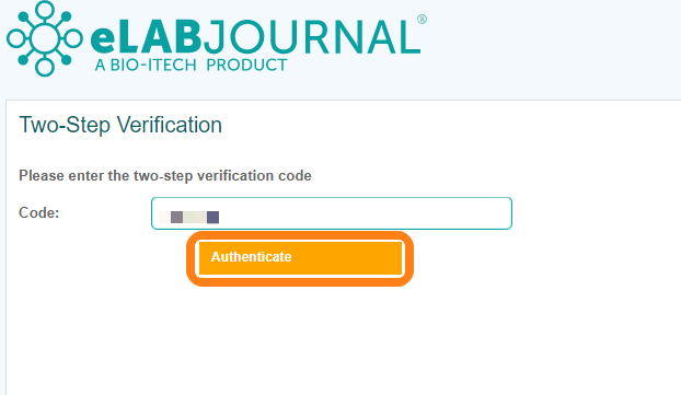 If two-step verification is enabled for your account, you'll need to enter the two-step verification code generated by your mobile device or any of the supported alternative 2FA-token generators you've connected with your eLabInventory account.
