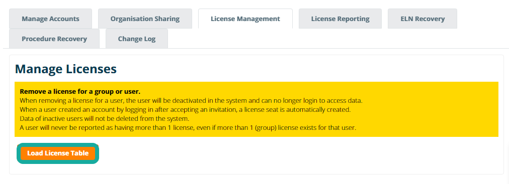 To manage issued licenses to groups or accounts in your organisation, open the License Manager tab in the Organisation Admin panel and click Load License Manager.
