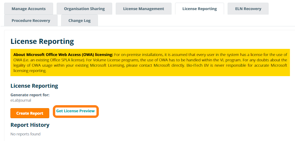 eLabInventory Private Cloud and On-Premises installations offer the option for license reporting. For internal cost break-downs per departments within an organisation or to report of licenses of supported third party add-ons, the Organisation Admin Panel offers a license reporting. Open the Organisation Admin panel and select the License Reporting tab and click Get License Preview.