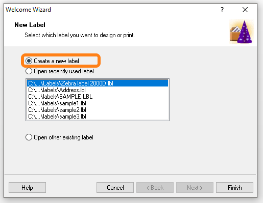 Install the program and open it. When the program is running choose Create a new label and click Next >