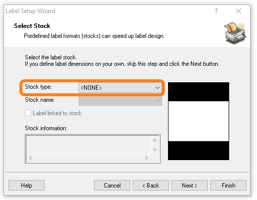 In the new pop-up choose your printer and click Next >. In the next screen choose Stock type: <NONE> and click Next >