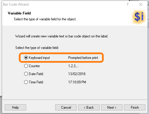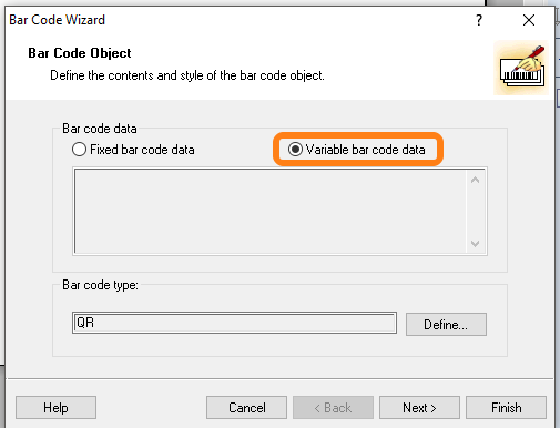 Click somewhere on the label. In the pop-up window ‘Bar Code Wizard’ select Variable bar code data and click on Next >.