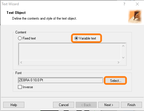 Choose Variable text and make sure the Font is set to ZEBRA 0. Font size can be adjusted if preferred. Click Next >