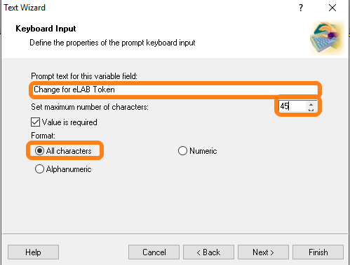 Fill in Change for eLAB Token and set maximum number of characters on 45, and click Finish.