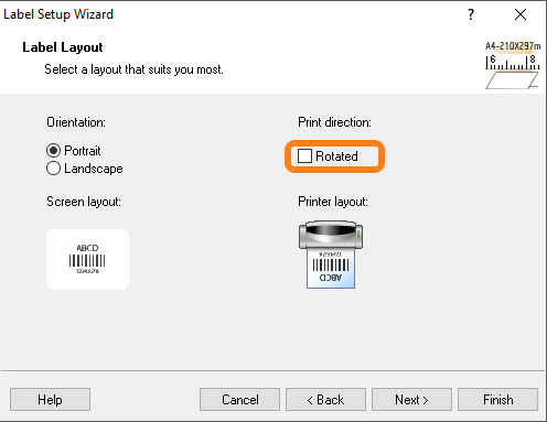 In the Label Layout uncheck the checkbox Rotated, this is so you have a good preview in eLabInventory, if your preview in eLabInventory is upside down it is because of this setting.