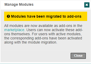Important Notice: All Modules have been migrated to add-ons. If your organisation activated has activated Marketplace, module activation is no longer required here. All modules have been migrated to add-ons and are now available in the Marketplace for all users to install.