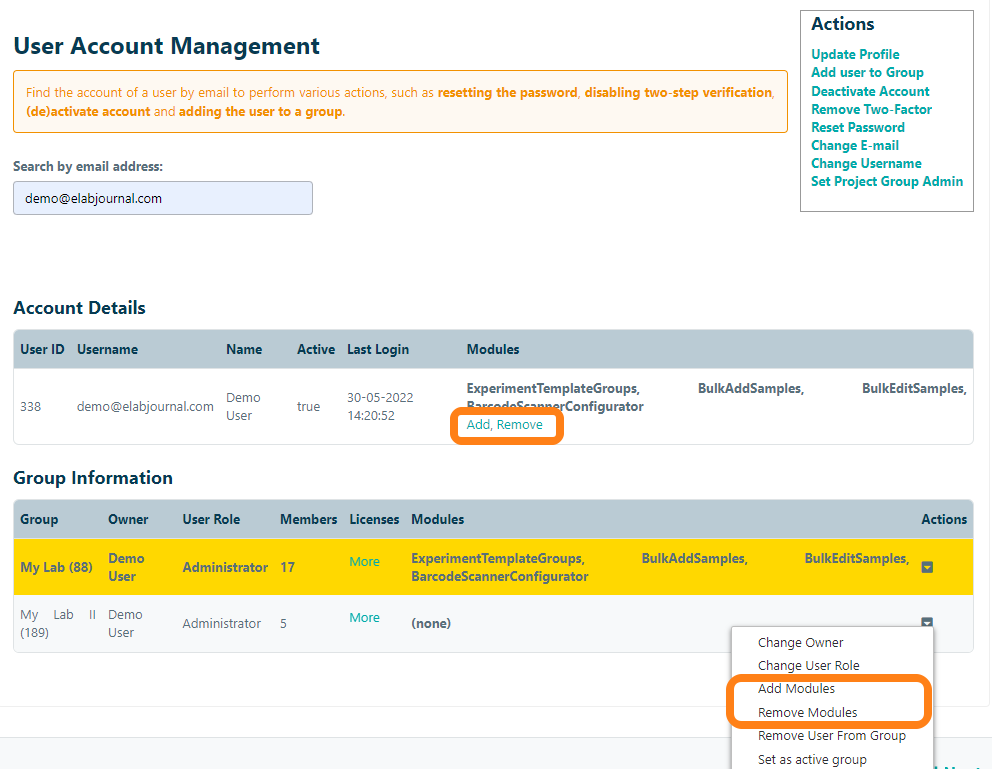 In addition to the basic functionality of eLabInventory, there are a number of additional supported features in eLabInventory which require additional installation of so-called add-on modules.