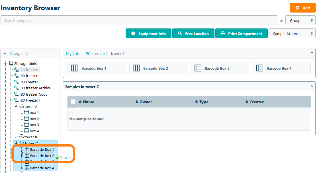 In addition to moving individual samples between storage units, users can move entire storage compartments to a new location. Navigate to Inventory Browser under the Inventory tab and select the compartment that you want to move from the navigation tree. Drag and drop the compartment to move it to a different storage location.