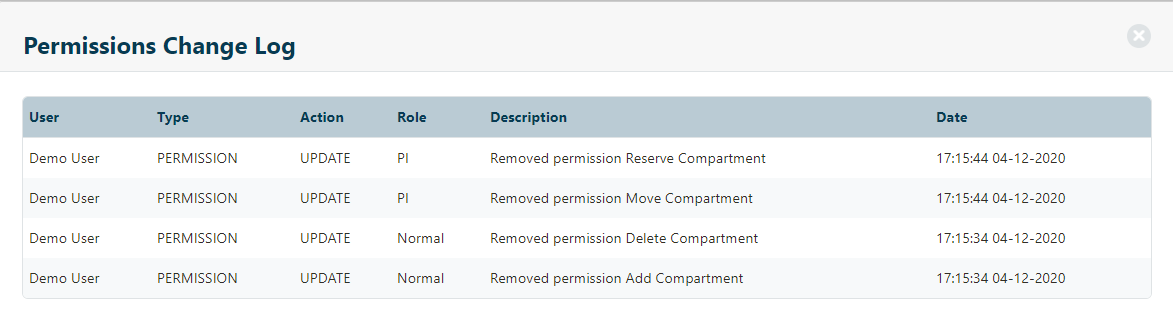 In the pop-up window, all permissions that have been added or removed for each user role are displayed in chronological order.