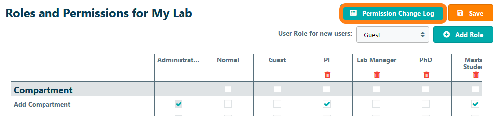 All changes made in Roles and Permissions are logged in the Permission Change Log. To open the change log, navigate to Roles and Permissions and click Permission Change Log.