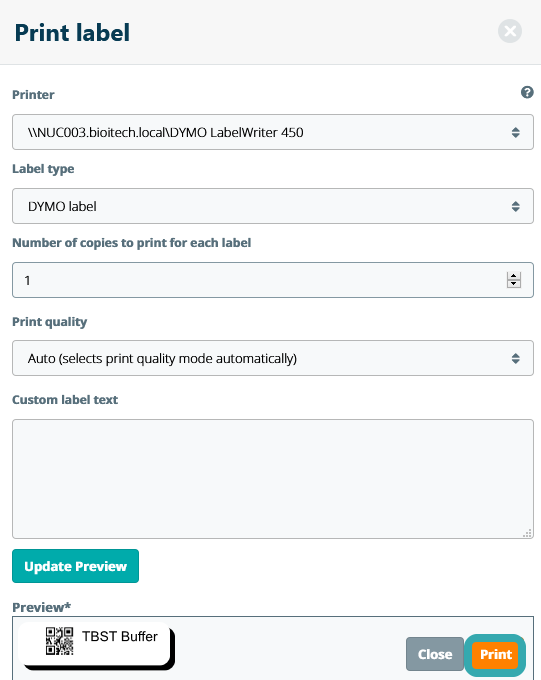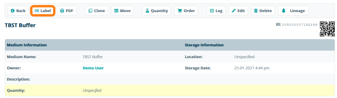 You can label tubes with a 2D barcode to better identify samples within the lab. To print barcode labels for your samples, first ensure that you have correctly installed one of the label printing add-ons available in the Marketplace. Once you have connected a printer to your account, you can print a label by clicking on the Label button on the sample information sheet.