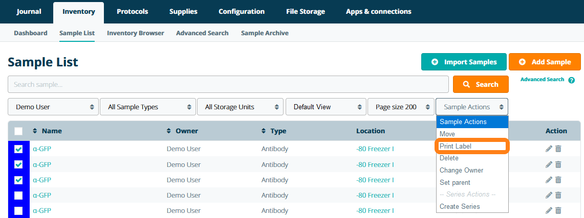 You can also print labels in bulk of multiple samples at the sample time by selecting samples using checkboxes and choosing the Print Label option in the Sample Actions dropdown menu that is present in the Sample List, Inventory Browser and the Advanced Sample Search.