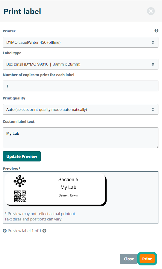 Choose one of the system template labels or add a custom label including a 2D barcode and click Print to print the barcode label.