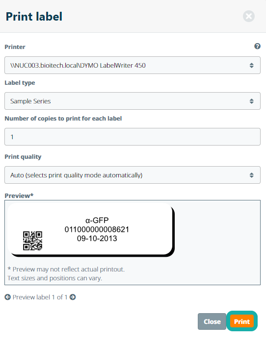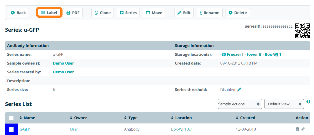 To identify multiple samples, you can also print a label for a sample series. To print a label with a 2D barcode for a sample series first, make sure that either the DYMO LabelWriter© or the Zebra Label Printer (ZPL) are correctly installed. After establishing a connection with the printer to your account, you can print a label by clicking on the Label button on the sample series information sheet.