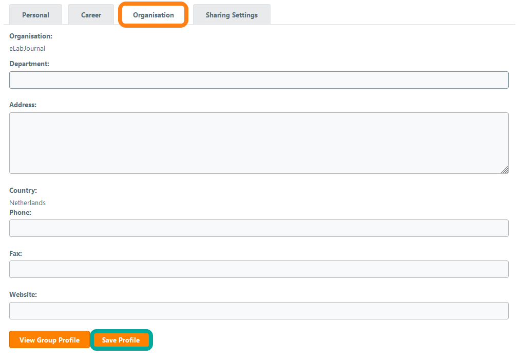 The fields that can be updated in the Organization tab are listed below. After editing your organization information, click Save Profile to save these changes.