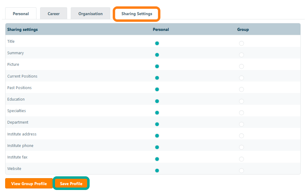 In Sharing Settings, you can determine whether the information listed should be visible to just your account or the entire group. Click Save Profile to save changes made to your sharing settings.