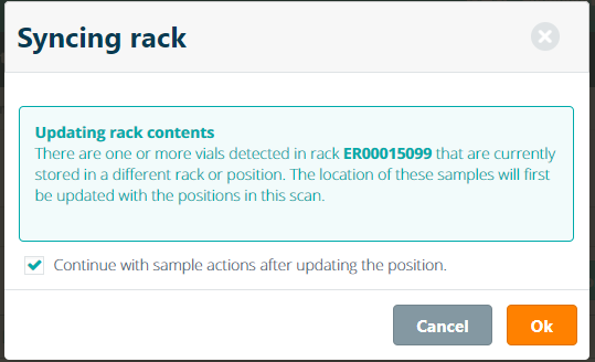 Click Ok to sync the positions of the samples in scanned Rack with the positions of the samples in eLabInventory
