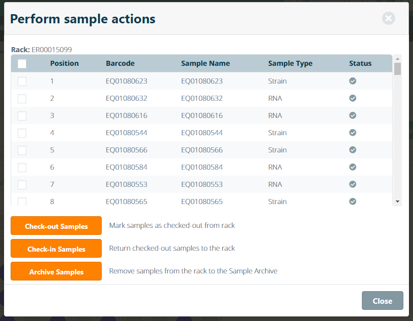 - Sample Check-out – Samples are marked as checked out from the box (i.e to indicate that the samples were taken from the freezer). This action is automatically logged in the sample log
