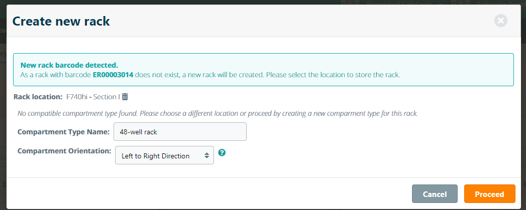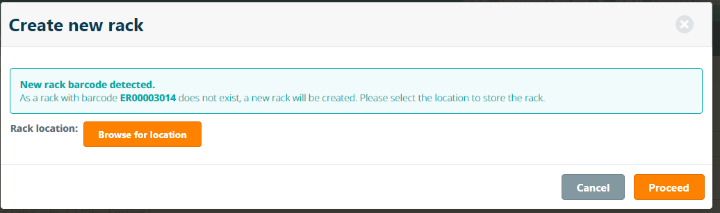In case no rack was identified in your group with an associated barcode that is identical to that of the scanned rack, the RackScan add-on will guide you through the steps to create this rack.
