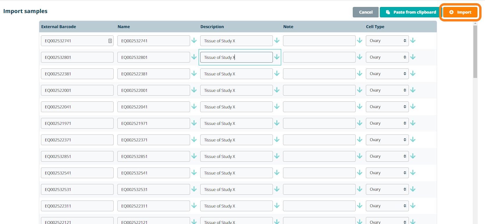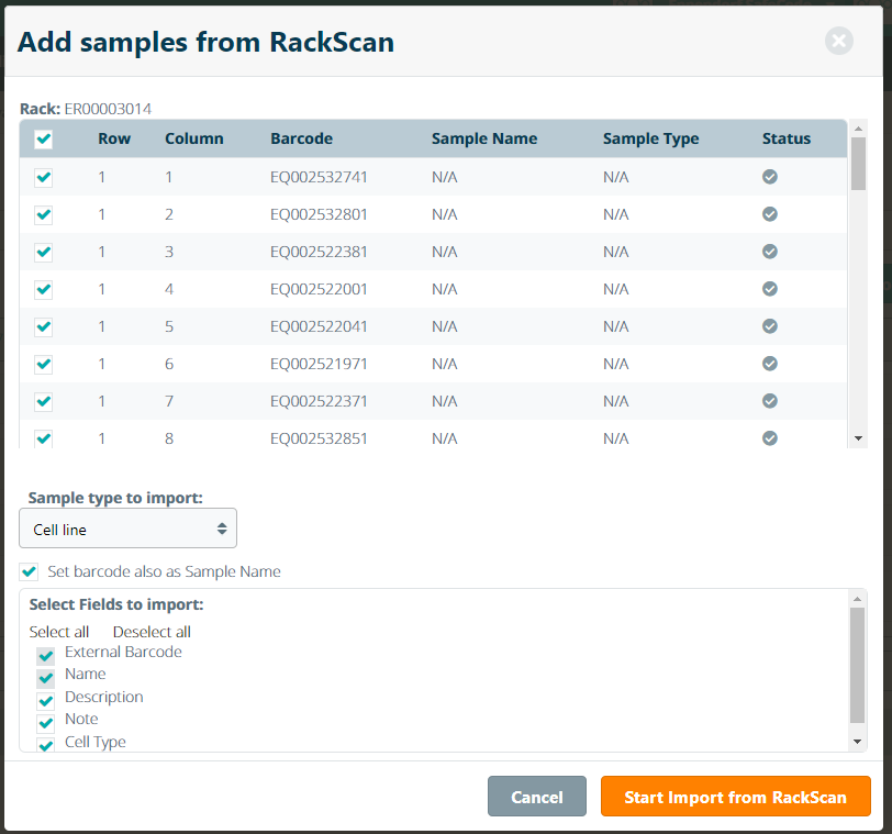 Start by selecting the sample type for the samples in the Cryovials you are storing (read here how to add custom sample type templates). Optionally you can choose to also set the barcode as the sample name by selecting the corresponding option. Click Start Import.