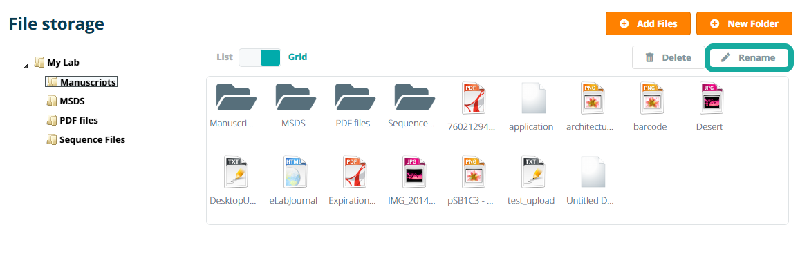To rename a file or folder in the File Storage select the file or folder in the File Storage. The rename option will then become active. Click Rename.