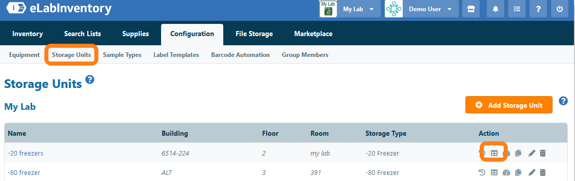 Within a storage unit, users can reserve compartments for a specific user or user role to store their samples. You can manage compartment reservation by navigating to Storage Units and clicking on the Reservation icon.