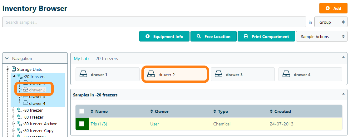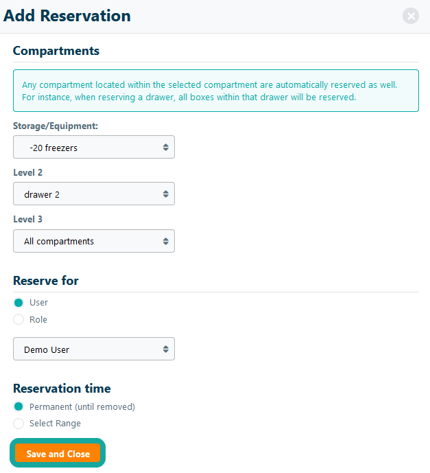 Note that reserved compartments only prevent other users to add samples or move samples into a reserved compartment. Viewing and searching samples remains unaffected in a reserved compartment.